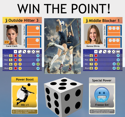 For each play, you'll roll the dice to find any extra points to your player's passing, set, attack and blocking skills. Use "bonus" cards to give added powers to win the point!